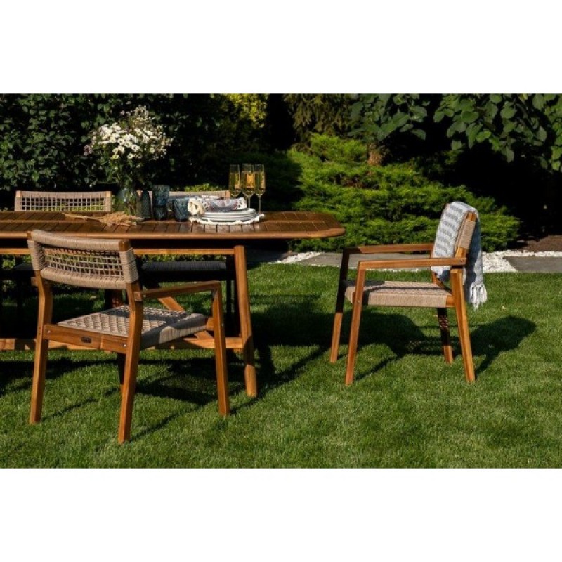 CALISTO – современная коллекция садовой мебели из акации, выполненная в комбинации натурального веревочного плетения rope, массива акации и бежевых подушек.